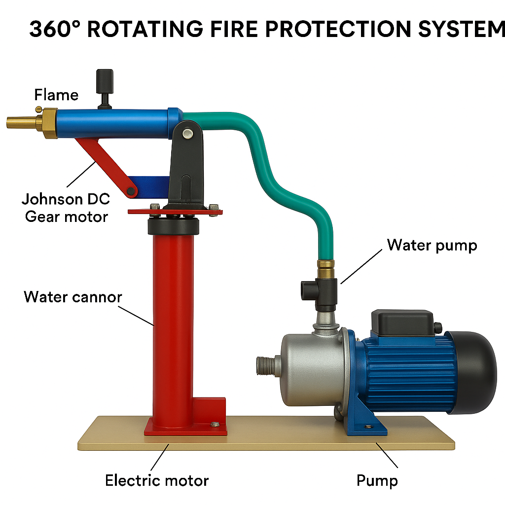 The 360° Smart Rotating Fire Protection System is an intelligent fire suppression project designed for industrial, laboratory, and educational applications.