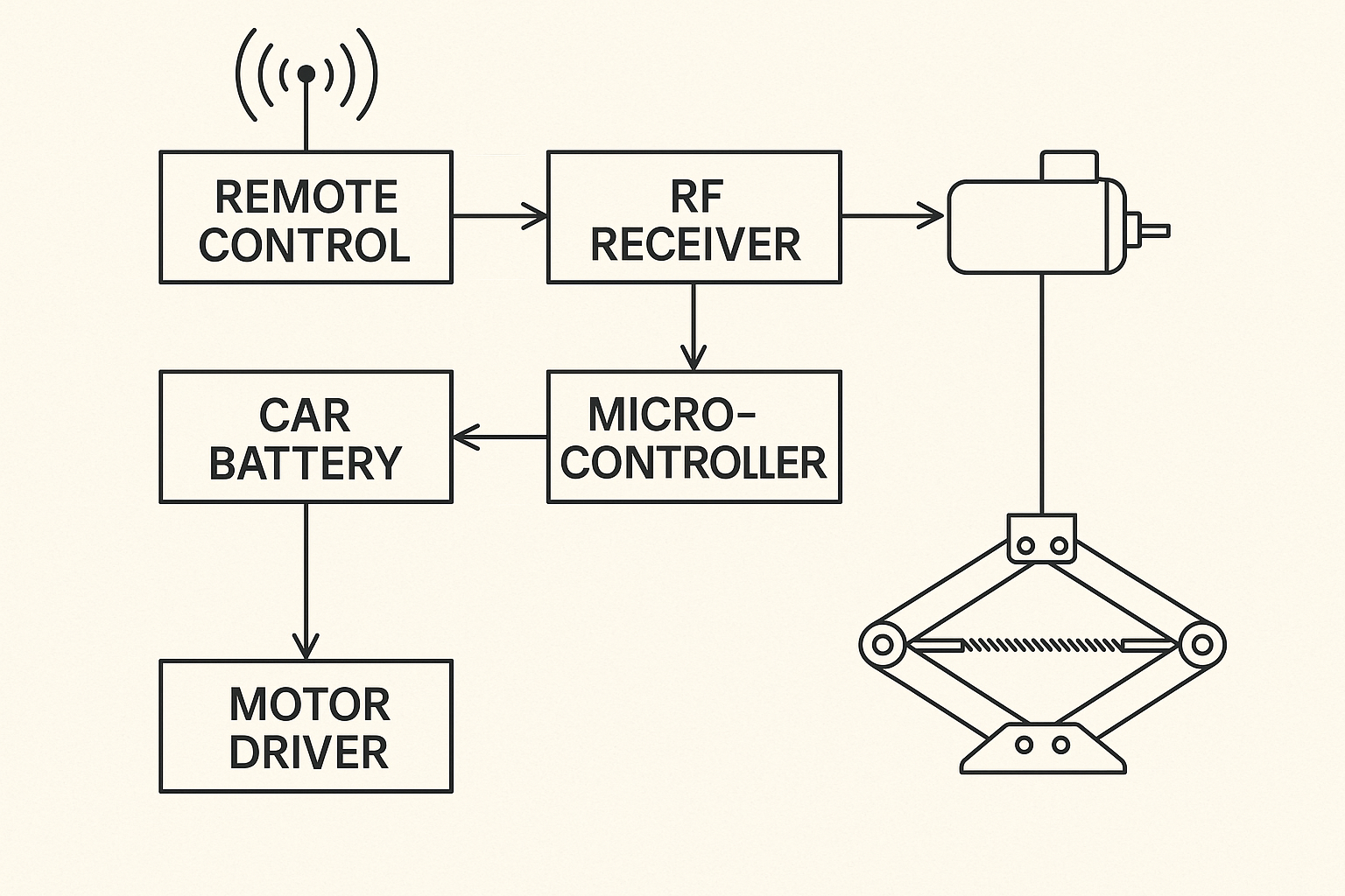 • This project highlights wireless automation in the automotive industry, where a simple button press on the remote can lift or lower the car using the motorized scissor jack. It’s an excellent choice for students interested in embedded systems, IoT, wireless communication, and mechanical integration.